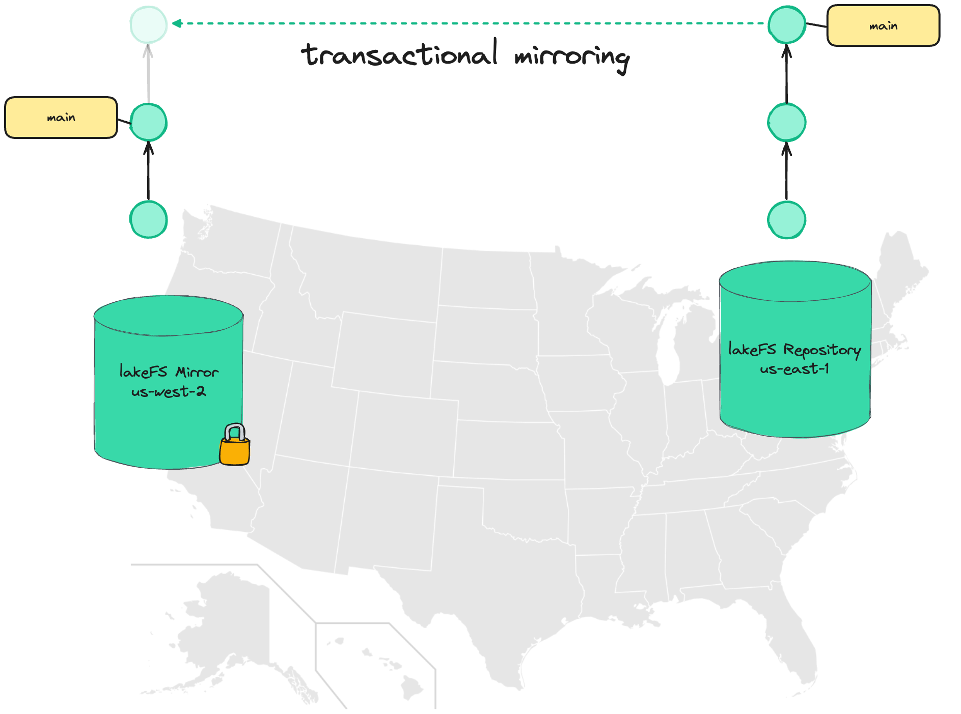Unlike conventional mirroring, data isn't simply copied between regions - lakeFS Cloud tracks the state of each commit, advancing the commit log on the mirror only once a commit has been fully replicated and all data is available.