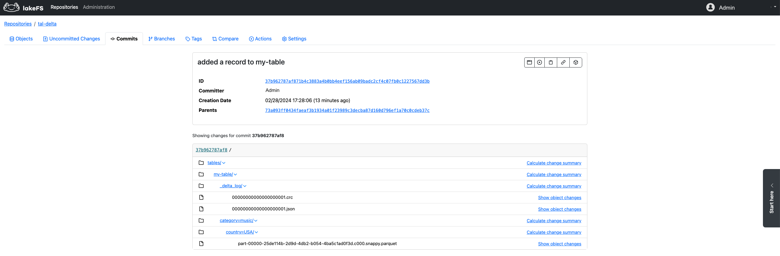 Consequently, when making changes to a Delta table within the lakeFS environment, these changes are reflected as changes to objects within the table location. For instance, inserting a record into a table named "my-table," which is partitioned by 'category' and 'country,' is represented in lakeFS as added objects within the table prefix (i.e., the table data) and the table transaction log. Record addition
